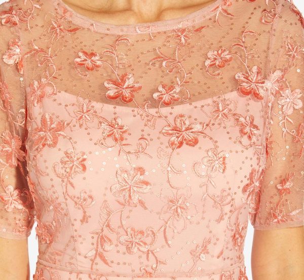 Playful and romantic, stunning 3D embroidered florals and sparkling hand sequined accents dance allover this one-of-a-kind cocktail dress. Designed in our iconic fit-and flair silhouette, this tea-length dress is detailed with a feminine illusion neckline and elbow sleeves, a seamed waist and sleek back zip closure. Head out to drinks, bridal showers, wedding receptions or black-tie galas in this sweet dress.|