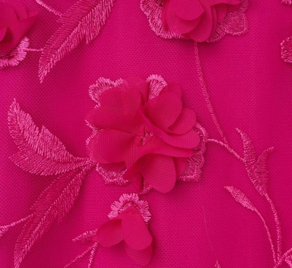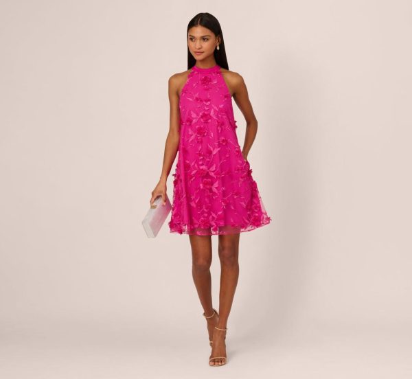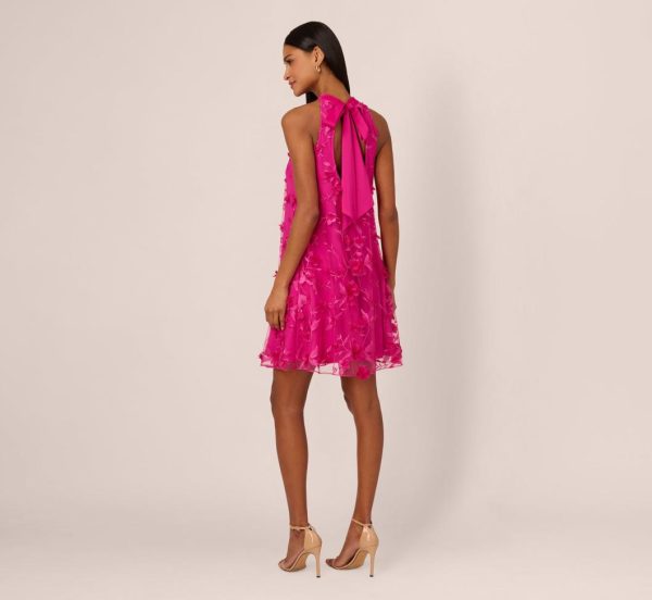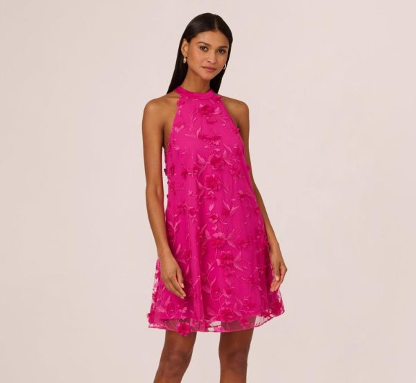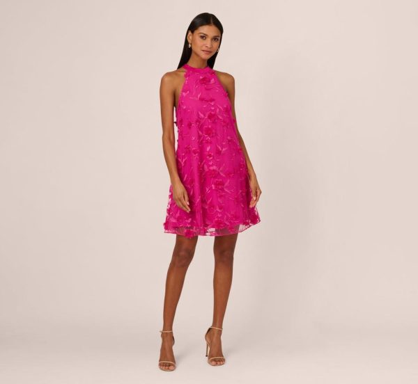 Sweet details bloom on this floral embroidered dress. This party dress features a halter neckline, trapeze silhouette, open back, and a self-tie satin bow accent. Crafted from mesh fabric embroidered with beautiful 3D flowers, this shift dress has pockets at the sides. Thissleeveless dress has minimal stretch. Styled with nude heels and a statement clutch, this cocktail dress is a chic look.|