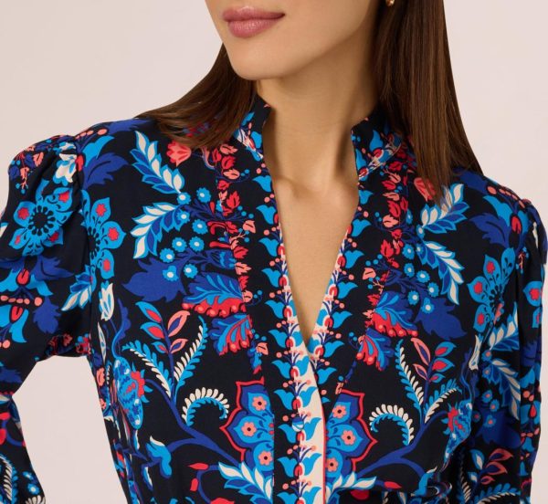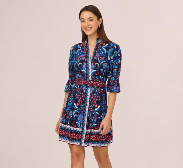 Embolden your look no matter the season in this printed button down dress. Crafted from soft rayon fabric, this shirt dress features a flattering v-neck neckline and three-quarter-length bell sleeves. The pleated flounce hem and delicate shirring at the waist add playful movement at the short skirt, while a rectangle belt detailing enhances the waistline for a tailored fit. Boasting an abstract vintage print ensures ease and versatility for any occasion, making it a must-have addition to your wardrobe. Styled with nude heels and a crossbody bag, this three-quarter sleeve dress is an appropriate|