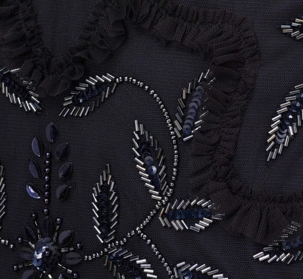 Make a stunning entrance in this exquisite beaded evening gown designed to captivate. This sophisticated formal dress showcases a beautifully fitted bodice with elegant tank straps, complemented by a flattering V-neckline and dramatic V-back design. The graceful A-line skirt flows effortlessly, creating a silhouette of timeless elegance. Crafted with meticulous attention to detail, this fully lined gown features luxurious knit mesh adorned with a dazzling array of sequins and intricate beading, enhanced by delicate embroidered ruffle accents. The secure zipper back closure ensures a perfect fit. Complete your black-tie ensemble with metallic heels and bold statement earrings for an unforgettable look.|
