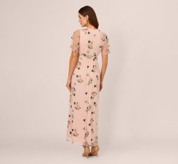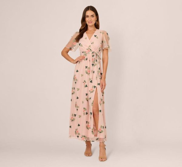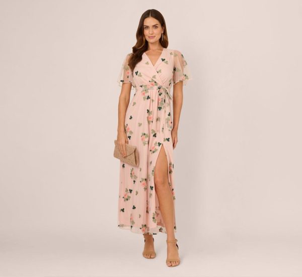 Designed for effortless elegance, this stunning floral embroidered dress transitions seamlessly from daytime weddings to special occasions. The flattering faux wrap bodice creates a beautiful silhouette while the delicate sheer flutter sleeves add a touch of romantic charm. Featuring a self-tie waist for customizable fit and a graceful maxi skirt with a subtle slit, this fully lined dress offers both comfort and sophistication. The intricate floral embroidery on the mesh overlay creates a luxurious texture that catches the light beautifully. Perfect for wedding guests, garden parties, or any occasion where you want to make a memorable impression.