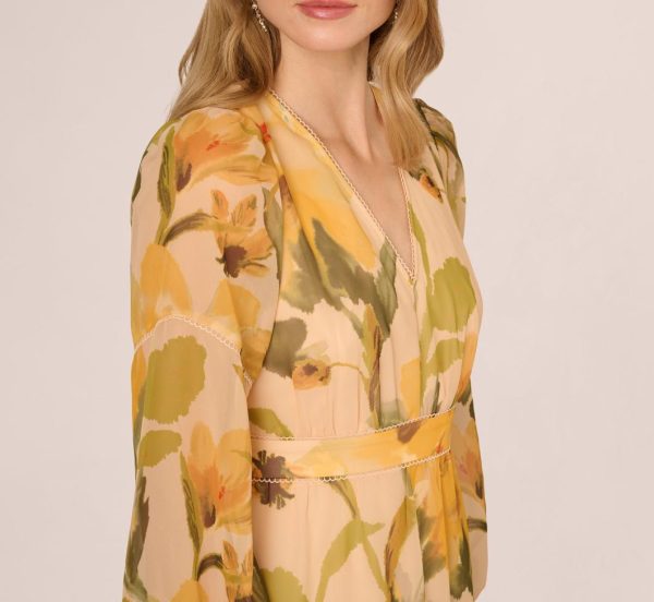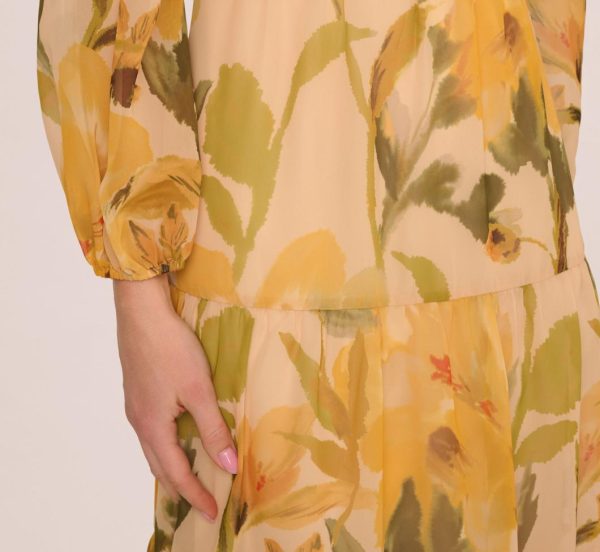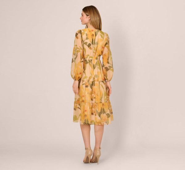 Experience timeless romance with this exquisite midi dress crafted from delicate floral organza that creates beautiful movement with every step. The flattering A-line silhouette showcases a gracefully tiered skirt featuring three artfully gathered panels that add elegant dimension. Dramatic sheer bishop sleeves provide a sophisticated balance to the design. Complete with a smooth back zipper closure, this V-neck dress offers effortless elegance for garden parties, wedding celebrations, or any special daytime occasion.|