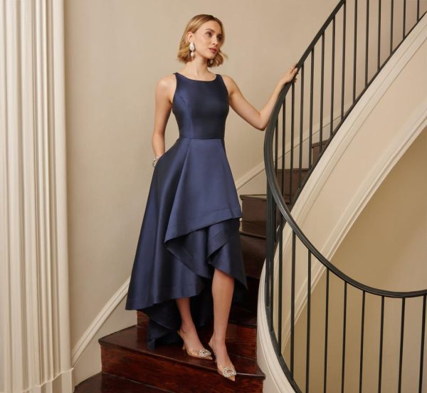 Make a stunning entrance in this exquisite sleeveless gown crafted from luxurious woven Mikado fabric. The dramatic high-low hemline creates a captivating silhouette with its elegant modified train. Designed for sophistication, this dress features flattering princess seaming, surprisingly convenient side pockets, and a sleek back zip closure for effortless wear.|