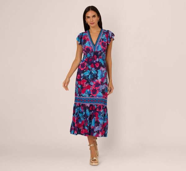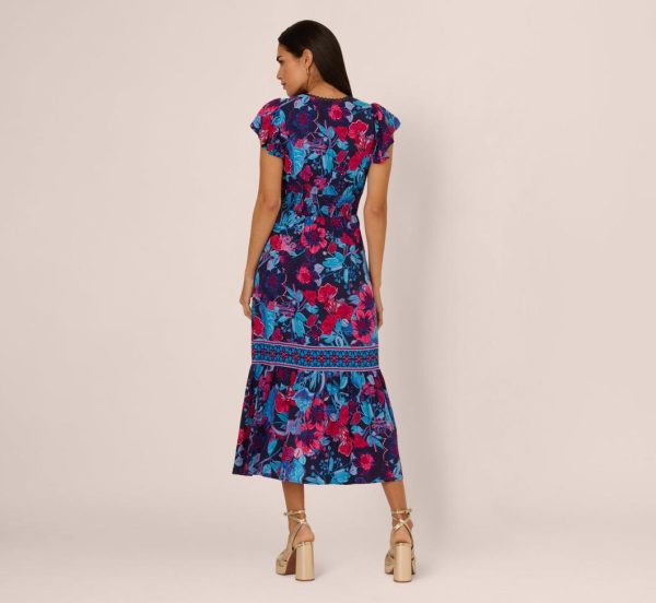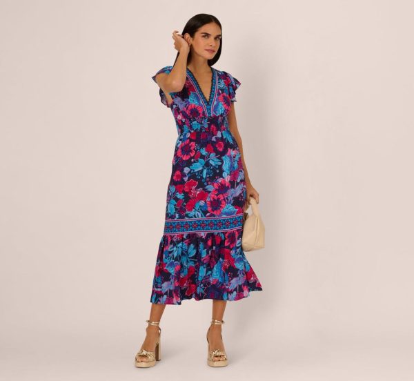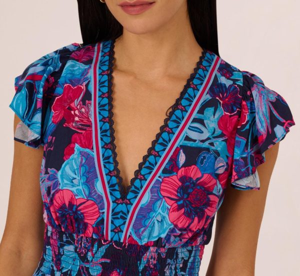 Elevate your vacation style with this stunning floral print midi dress that effortlessly transitions from beachside strolls to elegant brunches. The fitted bodice with a flattering V-neckline and delicate flutter sleeves creates a feminine silhouette, while the mid-length flounce skirt adds movement and grace. Crafted from premium woven viscose featuring vibrant floral patterns, the smocked elastic waist ensures a comfortable, customized fit. Contrasting geometric detailing at the neckline and elegant scalloped edging provide sophisticated accents. Perfectly paired with sandals or rattan accessories, this versatile dress delivers effortless style for all your warm-weather adventures.|