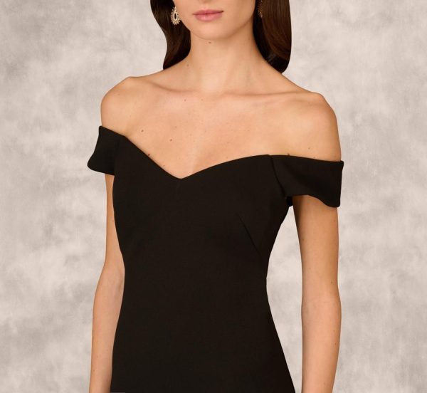 Expertly crafted in luxurious bonded crepe fabric, this stunning black gown features a flattering sweetheart neckline that beautifully frames the face with elegant off-shoulder sleeves. The sleek mermaid silhouette is accentuated by a dramatic tiered organza flounce below the knee, creating a show-stopping effect that moves with you. Easy back zipper closure ensures a seamless fit for your special occasion.|