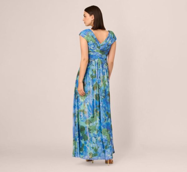 This stunning cap sleeve V-neck gown features a beautiful abstract floral print that creates an effortlessly flowing silhouette. The elegant gathered twist details at the center bust and back add sophisticated dimension to the design, while the back zipper ensures a flawless custom fit. Perfect for special occasions, this romantic yet modern gown delivers timeless elegance with contemporary style.|