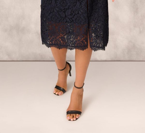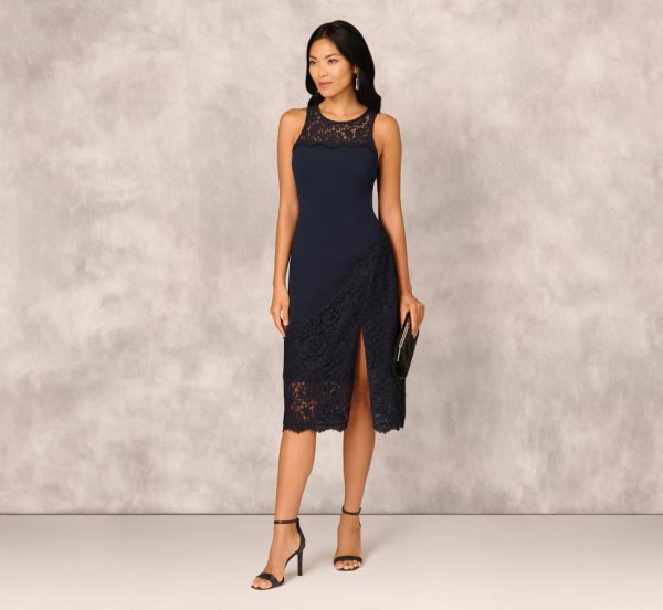 Experience sophisticated elegance with this navy cocktail dress featuring a stunning illusion neckline enhanced by delicate lace detailing. The asymmetrical lace panel on the skirt hem creates a contemporary statement piece that transitions effortlessly from daytime events to evening occasions. A discreet back zipper provides a flawless, tailored silhouette that flatters your figure while maintaining the classic sheath dress appeal. This Adrianna Papell design masterfully blends timeless elegance with modern sophistication for your most memorable events.|