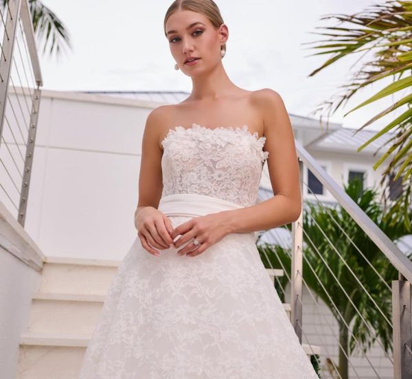 All over corded lace sets the stage on this stunning A-line gown. The lace had been cut out and reapplied to the neckline in a 3D method to create texture and volume. A modern, oversized, mikado bow has been placed at the back neckline and matches back to a wide, pleated waistband. Both the bow and the waistband are fully detachable. There are pockets at the side seam.