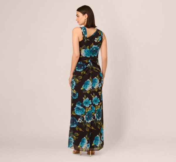 Experience sophisticated elegance with this stunning draped mermaid gown. Designed in beautiful black multi floral chiffon, this sleeveless maxi dress showcases an asymmetrical strap design that creates a flattering face-framing effect. Expertly placed gathers at the shoulder, waist, and center back enhance the fitted silhouette with dimensional detail. Flowing ruffles cascade from the waist down the skirt, beautifully accentuating the side slit. Complete your formal look with the ease of a back zipper closure for effortless wear.|
