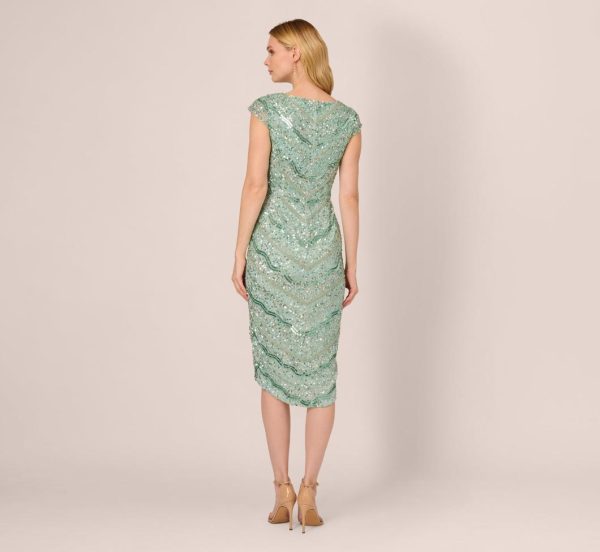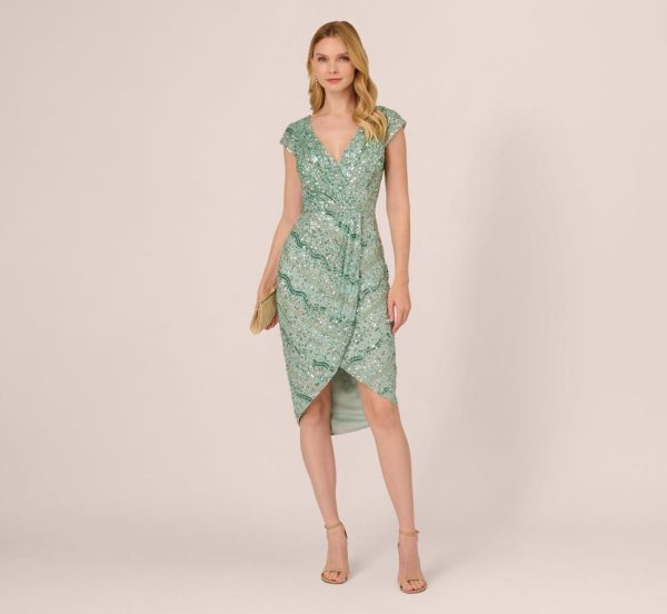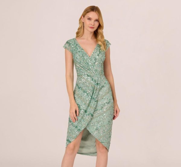 Elegant beading elevates this cap sleeve party dress. This midi dress features a surplice bodice with v-neckline, sheer cap sleeves, and a faux wrap skirt. Crafted from mesh fabric, this faux wrap dress is lined through the body and boasts all over sequins punctuated by lines of beading. A zipper closure at the center back completes this cocktail dress. Styled with metallic high heels and a clutch, this beaded midi dress will shine.|