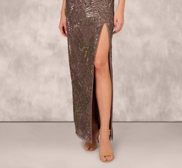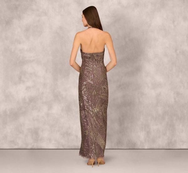 Turn heads all night in this luxe hand-beaded column gown. This full-length halter dress is embellished with an exquisite abstract linear pattern of shimmering beads and sequins. The column silhouette with a thigh high side slit adds a touch of old Hollywood allure, while the back zipper ensures a perfect fit. Elevate your style with this elegantly crafted gown.|