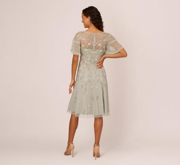 Dripping in delicate details, this floral beaded dress can’t be missed This midi length dress features a fitted bodice with v-neckline, sheer sleeves with tiered details, and a soft skirt. Crafted from mesh fabric embellished with a romantic mix of sequins and beading that form 3D florals, this boho dress is a romantic styling. A zipper at the center of the back closes the look. Teamed with a metallic heel and beaded clutch, it doesn’t get any better than this look.|