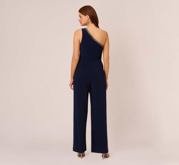 That perfect evening jumpsuit that blends classic elegance with a side of fun. Get ready to get the party started in our stretch matte jersey jumpsuit featuring a one-shoulder silhouette and sparkling embellished neckline. The wide-leg pants are finished with a lightweight shirred overlay. Side zip closure.|