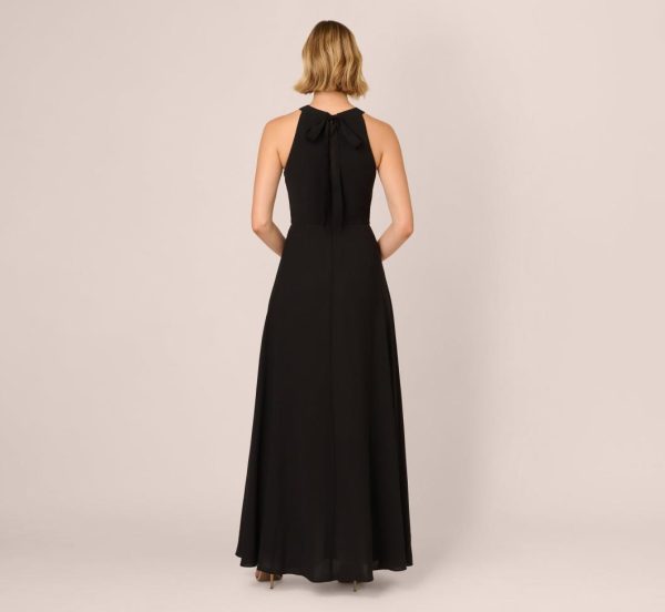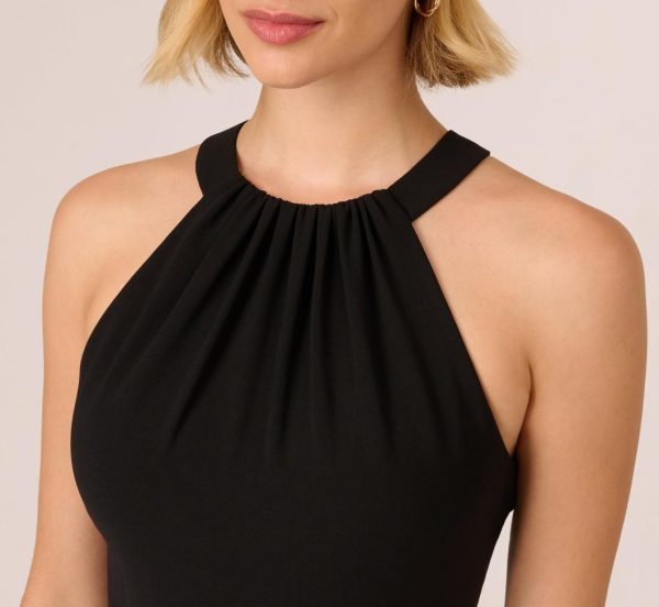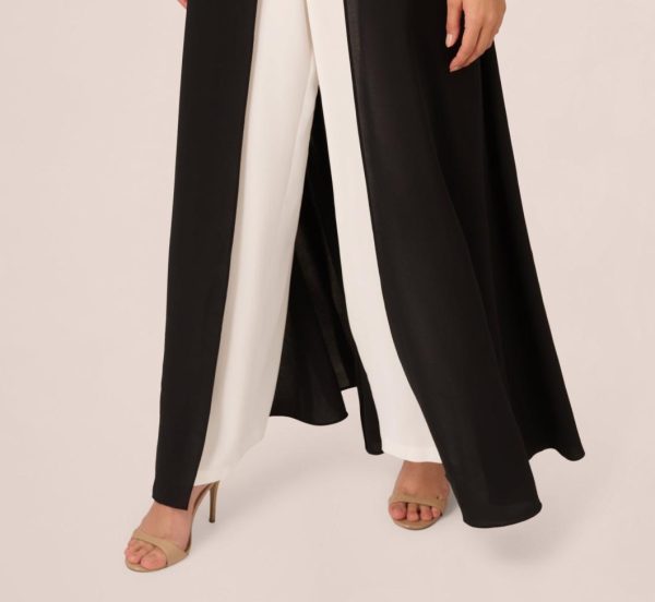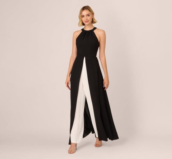This elegant wide leg halter jumpsuit features a sophisticated crepe fabric construction that creates a beautifully structured silhouette. The bodice gracefully transitions at the waist into a full-length skirt overlay, revealing a contrasting wide-leg pant design. The neckline gathers into a chic circular crew neck collar, with a convenient back zipper ensuring easy wear and completing this stunning jumpsuit’s polished look.|