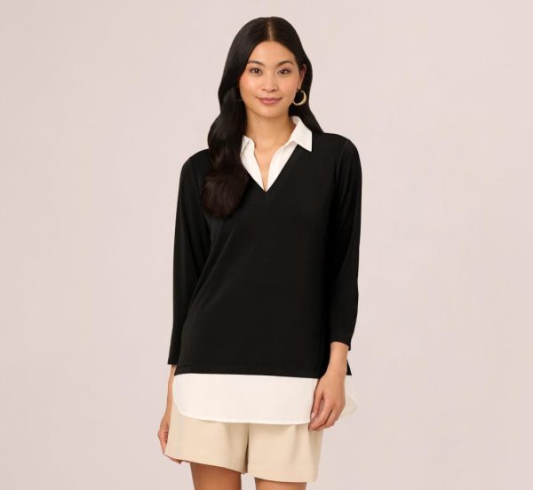 Experience effortless sophistication with this innovative twofer sweater that delivers the perfect layered look without any added bulk. The premium knit fabric offers exceptional comfort with three-quarter sleeves for versatile wear, while the crisp woven collar and peek-a-boo shirt sleeves create a beautifully styled ensemble that looks professionally put together. This versatile top transitions seamlessly from office wear to weekend outings, making it your new go-to piece for any occasion.|