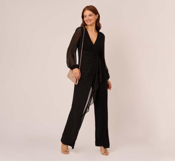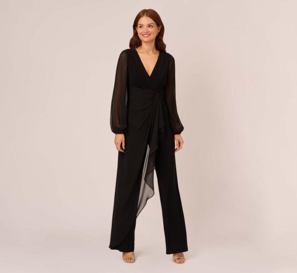 Elevate your wardrobe with this sophisticated long sleeve jumpsuit that transitions effortlessly from day to evening. The tailored bodice features a flattering V-neckline and elegant bishop sleeves that add graceful movement. Delicate chiffon detailing creates beautiful pleating at the bodice that flows seamlessly through the silhouette. Designed with wide-leg trousers and a discreet back zipper, this versatile piece combines comfort and style. The premium jersey fabric offers exceptional stretch and all-day wearability. Perfect for professional settings or special occasions when paired with your favorite heels and accessories.