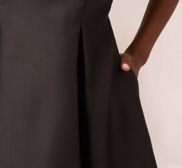 Experience timeless elegance with this sophisticated mikado cocktail dress. The sleeveless design features a flattering fitted bodice, elegant boat neckline, and a beautifully pleated flare skirt with convenient side pockets. A smooth zipper closure and dramatic deep V-back create a stunning silhouette perfect for semi-formal occasions. Crafted from luxurious shining mikado fabric, this fit and flare dress offers exceptional versatility. Dress it up with statement accessories or keep it streamlined with minimalist details – this versatile piece will become a cherished addition to your wardrobe for years to come.|