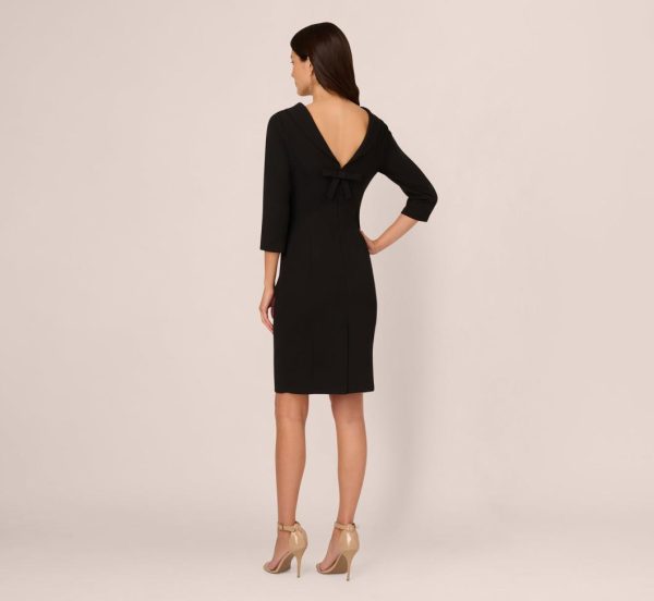 Step into effortless sophistication with this timeless three-quarter sleeve midi dress. The elegant boat neckline transitions seamlessly into a graceful shawl collar at the back, creating a polished silhouette that commands attention. Three-quarter sleeves provide refined coverage while the chic bow detail at the back adds a touch of feminine elegance. Crafted from stretch knit crepe fabric, this bodycon dress offers exceptional comfort and mobility throughout your workday. The center back zipper ensures a smooth, flawless fit, making this crepe dress a versatile wardrobe essential perfect for professional settings and daytime occasions with confidence and style.|