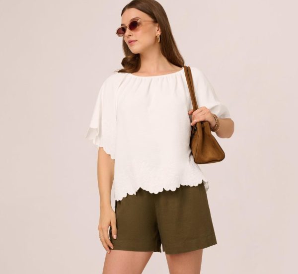 Textured crinkle fabric gives this top its breezy flowing feel. The above-the-elbow sleeves and hem are edged with scalloping and finished with tonal floral details. A gathered boat neck collar with a keyhole closure at the back adds a romantic feel to the design. This relaxed fit top gives any outfit effortless sunny style and lightweight comfort.|