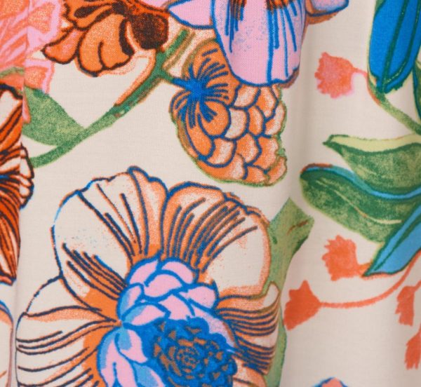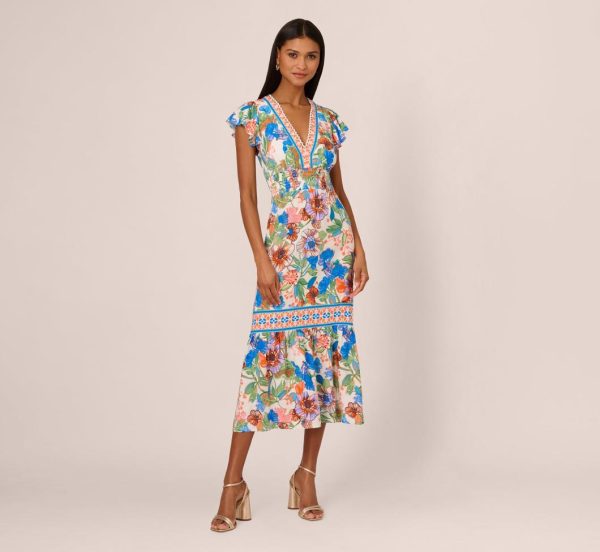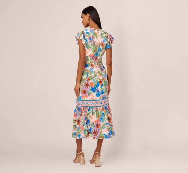 Go for a preppy look when you head out in this floral print midi dress. This dress features a fitted bodice with medium v-neckline, short flutter sleeves, and a mid-length flounce skirt. Designed from woven cotton covered in bright drawn flowers, the smocked elastic waist makes this pull-on dress a comfortable fit. Contrasting geometric print adds interest to the neckline and breaks up the skirt. Scalloped edging further highlights the v-neck. Styled with sandals or rattan accessories, this midi dress will impress from boardwalk to brunch table and beyond.|