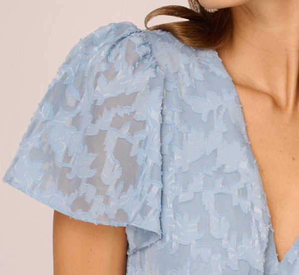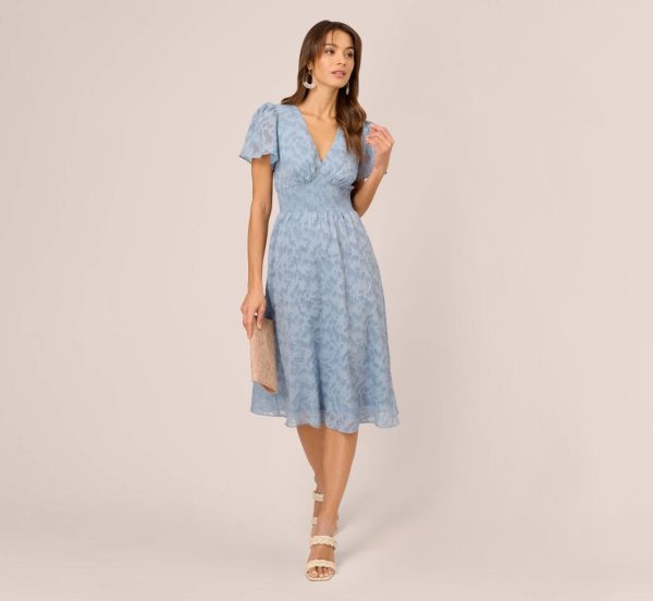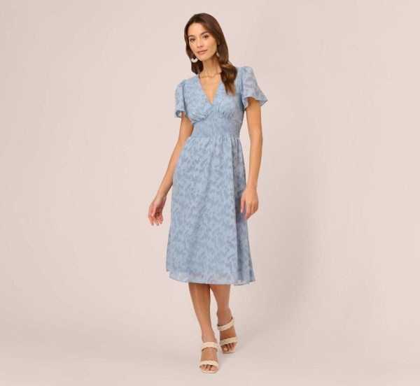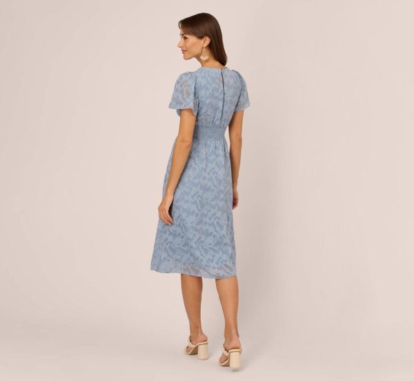 Make every day special when you rock this smocked dress. This midi dress features flutter short sleeves, a v-neckline, a smocked waist, and a soft skirt. Crafted from burnout jacquard fabric, this playful dress is sheer at the sleeves. Stunning for day occasions or vacation, this pull-ondress has a keyhole back with hook-and-eye closure. Step into mules or nude heels and add a fun handbag to complete this short sleeve dress.|