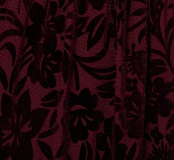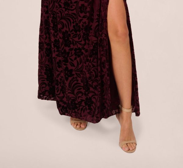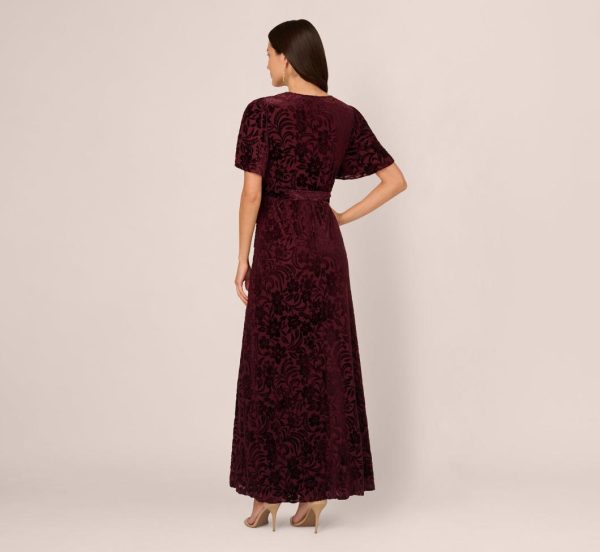 This lovely gown pairs the romance of floral burnout velvet fabric with an elegant full length silhouette. The faux wrap front creates a V-neckline, finishing in an elasticized waist for a comfortable fit. A matching tie belt, soft flutter sleeves and a dramatic side slit complete the look with graceful movement. Timeless sophistication makes this maxi dress the perfect choice for celebrating a special occasion.|