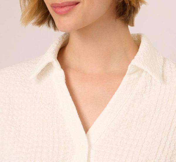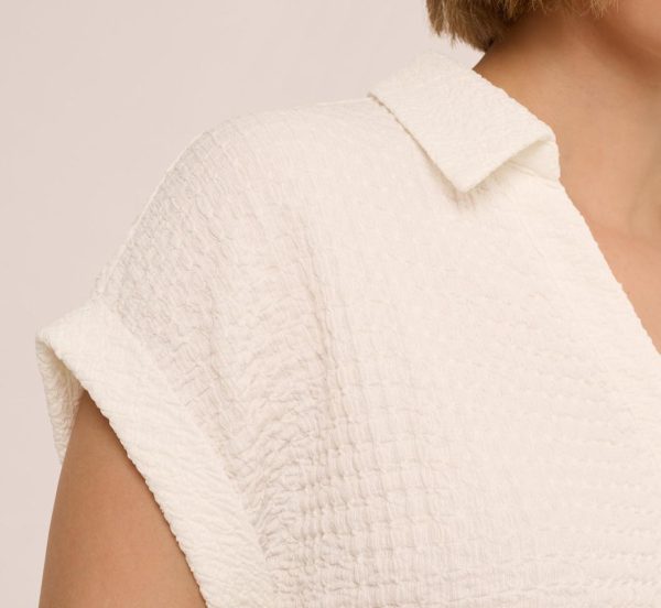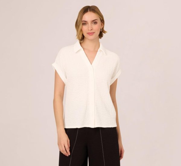 Light and breezy, this cap sleeve blouse is that everyday staple you’ll reach for over and over when planning your warm weather ensembles. The textured semisheer fabric is designed to allow for superior air flow, keeping you cool and comfortable all day. The collared V neckline and button front design create a polished look that’s perfect for the office or a brunch date on the weekend.|