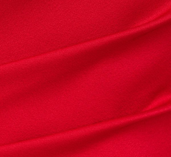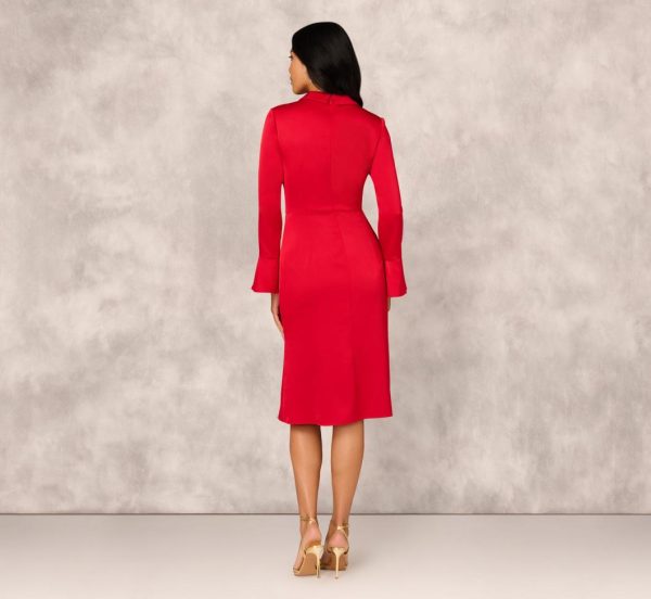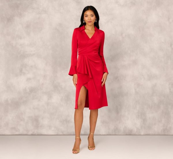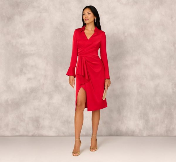 A smart update to the classic wrapped shirt dress, this red satin cocktail dress features a sewndown faux wrap bodice and skirt design. The long sleeves are finished with bell cuffs and the Vneck is framed with a collar, adding dimension to the sleek sheath dress silhouette. Drapeddetails at the front of the skirt create subtle movement and a back zipper finishes the design.|