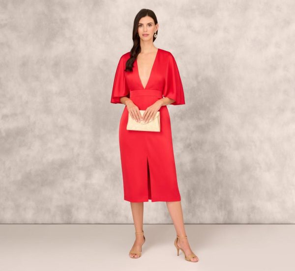 This evening’s look? Simply effortless. This cocktail dress features a fitted bodice with plunging v-neckline, a figure-flattering midi skirt with split front, and elbow-length flutter sleeves. Crafted from crepe-back satin, this party dress is as comfortable as it is chic. A zipper at the center backcompletes this midi dress. Styled with nude heels and a sequin embellished hand-bag, this satin dress is perfect for semi formal and cocktail attire affairs.|