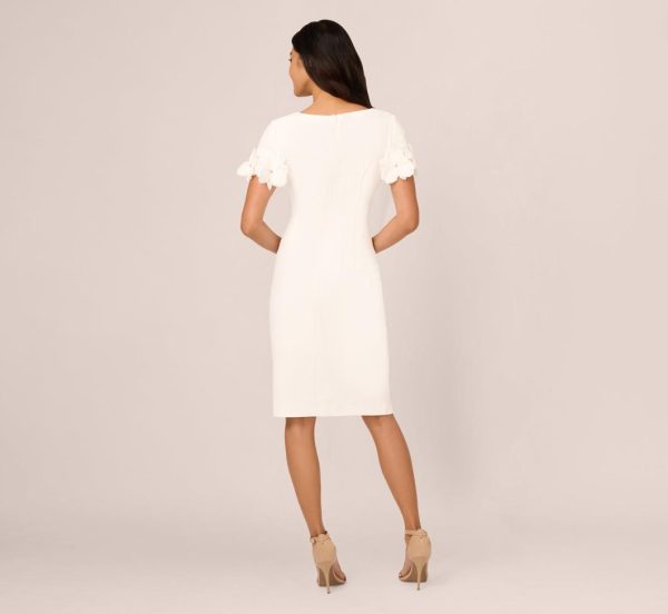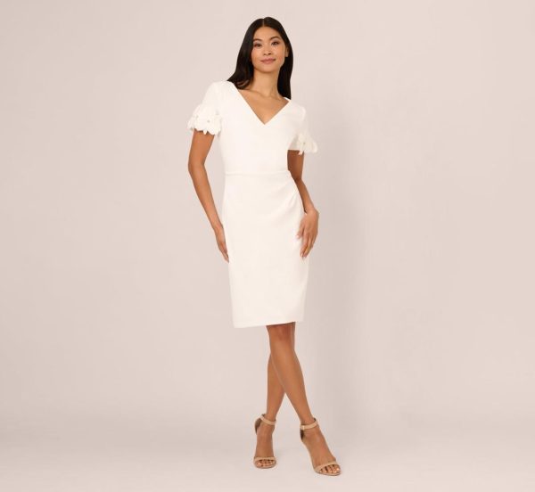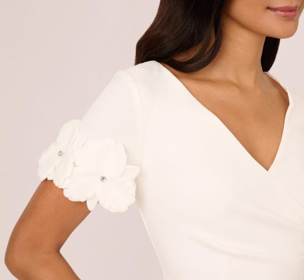 Designed to impress, this short sleeve sheath dress hits all the right notes. This fitted dress features a surplice bodice with v-neckline, short sleeves adorned with 3D floral accents, and draped details through the body. Crafted from knit crepe fabric with generous stretch, this dresshas no waist seam making it comfortable for all body types. A zipper closure at the back completes this party dress. Wear this short sleeve dress with pumps at the office or step into heels for a night out. Wherever you go, this dress will impress.|