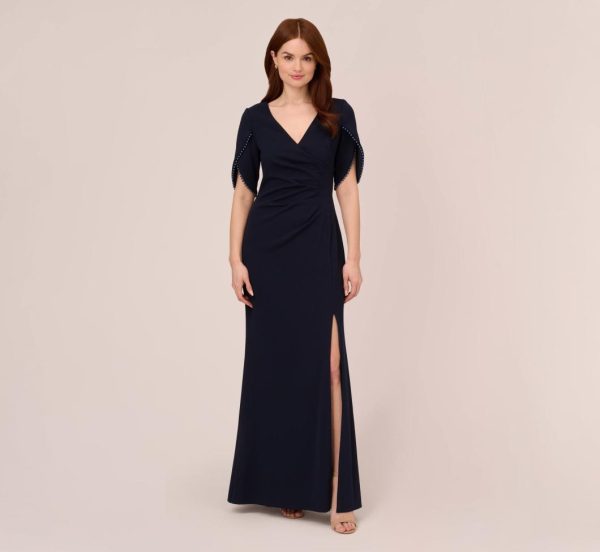 Crepe Mermaid Gown With Pearl Trim Short Sleeves In Midnight | Women Adrianna Papell Black Tie Dresses