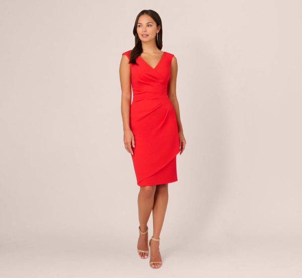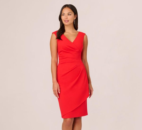 Classic and modern elements make this fitted dress the perfect style. This sheath dress features a v-neckline, a sleeveless bodice, and a cascading overlay. The draped details give this style a faux-wrap dress look. Crafted from crepe fabric, this dress has a comfortable amount of stretch. A zipper back and hook and eye closure is this finishing touch on this crepe dress.|