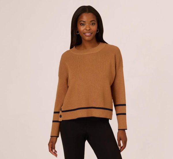 Elevate your cozy collection with our crew neck pullover sweater. Boasting a relaxed fit with dropped shoulders, this sweater exudes effortless sophistication and comfort. The chic tipped details and side button accents at the waist add a touch of refinement, ensuring a unique and stylish look. Ideal for layering or as a standalone statement piece, this sweater transitions seamlessly from day to evening no matter the dress code.|