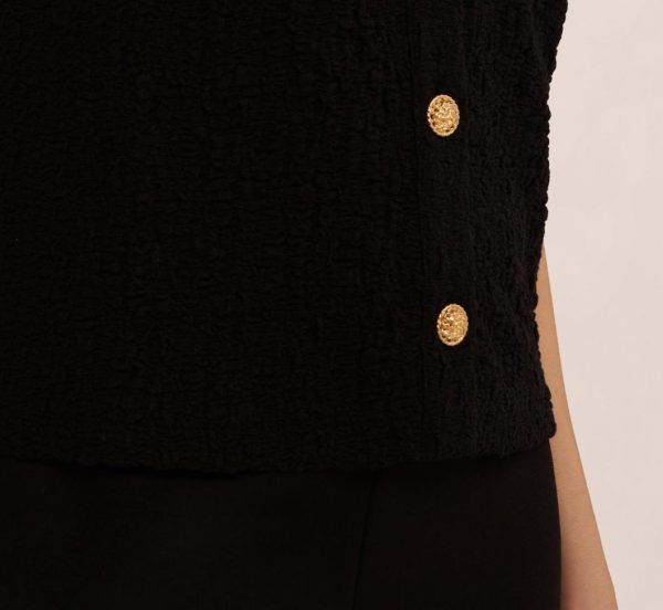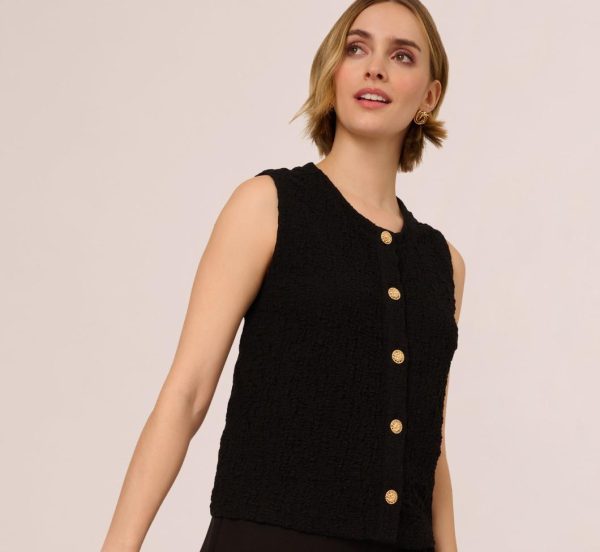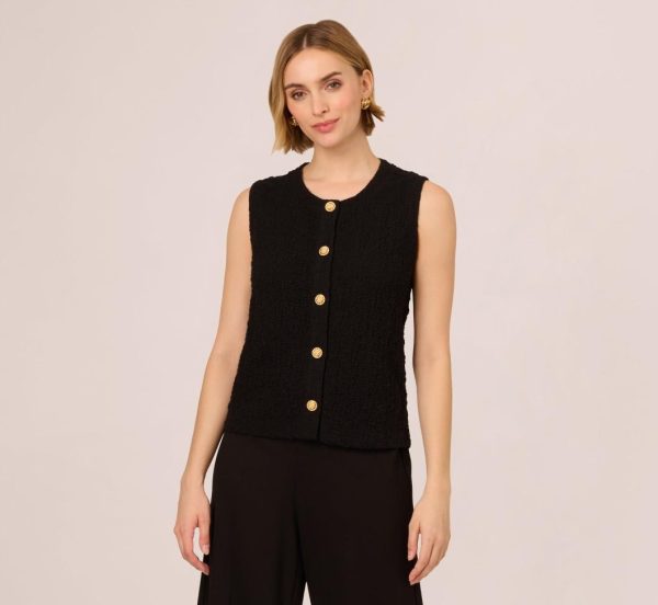 Add soft texture to any outfit with this smart knit sweater vest. The subtle crinkle finish on the fabric creates dimension and metallic buttons down the front complete the design with a luxe touch. Easy to layer with a comfy stretch construction, you’ll love how versatile this vest is. Pop it on over a collared blouse for a perfectly polished work look or wear it on its own with a wide leg pant for a breezy weekend ensemble.|