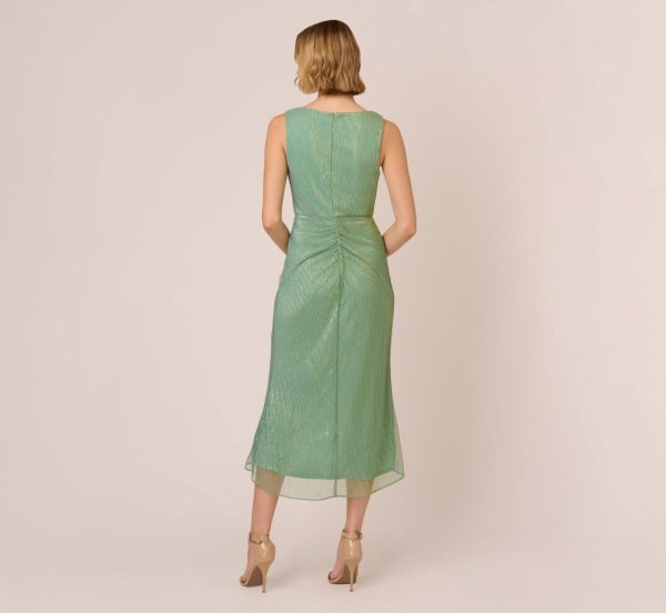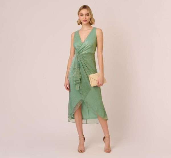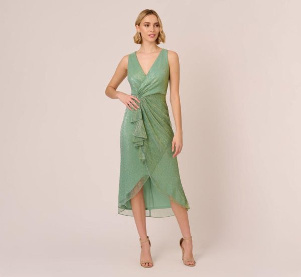 Elevate your evening wardrobe with this stunning metallic faux wrap dress that transitions effortlessly from day to night. The sleeveless design features a sophisticated surplice bodice with a flattering V-neckline, complemented by a faux wrap skirt and elegant draped detailing at the waist. Expertly crafted from innovative crinkle metallic knit fabric, this midi-length dress offers a comfortable fit with its full lining and subtle stretch. A discreet zipper closure at the center back ensures a seamless silhouette. Pair with neutral heels or sandals for a show-stopping look that commands attention at any event.|