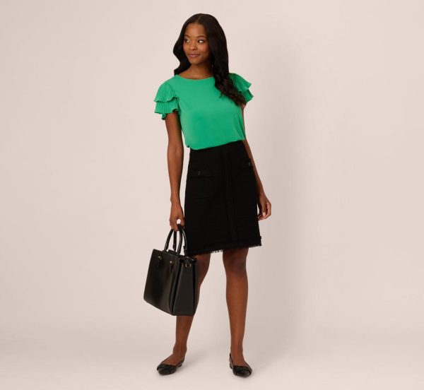 Make a stylish impact when you opt for this flutter sleeve top. This blouse features a crew neckline, loose silhouette, and double flutter sleeves with Pleated details for contrast. Crafted from solid knit fabric, this top is lightweight and flows beautifully for an elevated look. Styled fora day at work with slacks or date night with denim, this short sleeve top is a versatile design.|