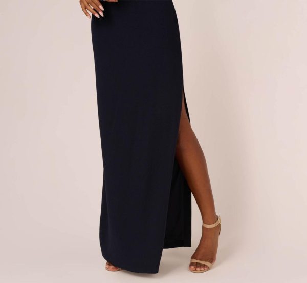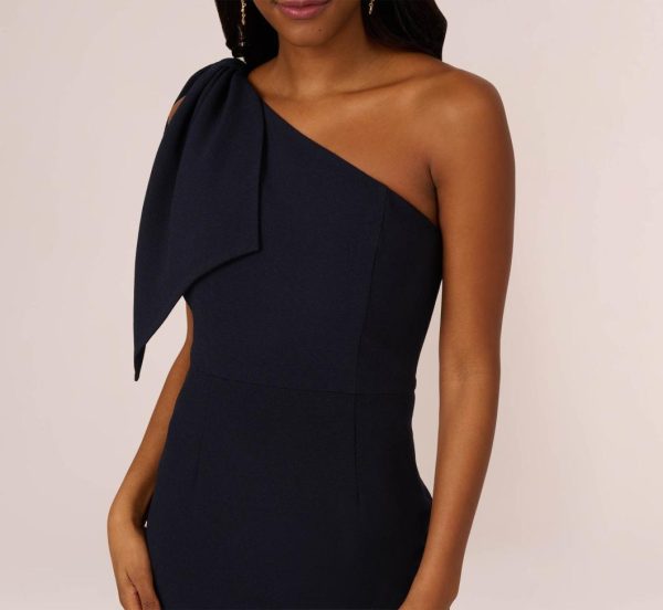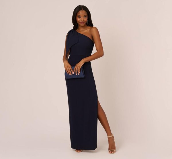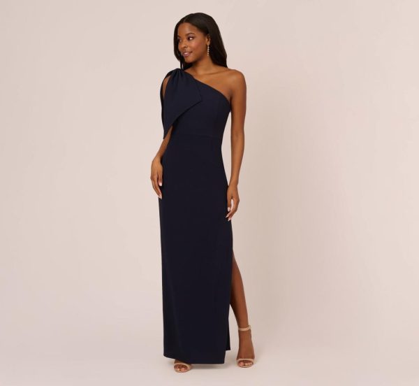 Make a stunning entrance in this sophisticated crepe evening gown designed for formal occasions. This elegant dress showcases a flattering one-shoulder neckline, a beautifully fitted bodice, and a graceful column skirt with a strategic slit for easy movement and dramatic appeal. The standout feature is the bold, sculptural bow that elegantly tops the shoulder, creating a fashion-forward statement. Crafted from luxurious crepe fabric with a hidden side zipper for seamless closure, this gown offers both comfort and impeccable style. Complete your red-carpet look with strappy heels and sparkling accessories for an unforgettable evening.|