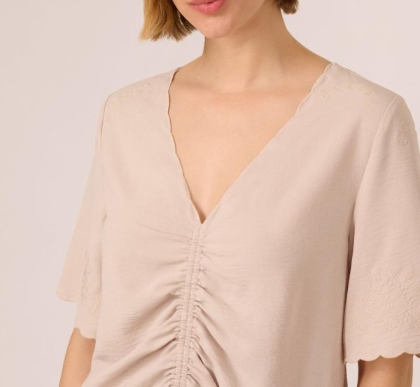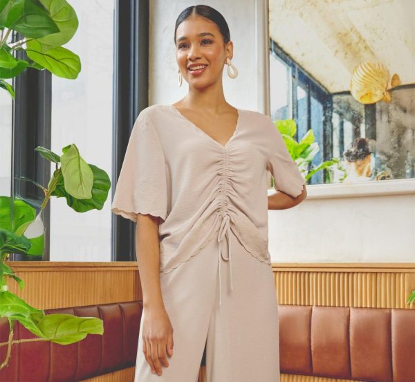 It’s the most effortless, breezy outfit you’ll ever own, and you’ll still look put together in this matching top and pant set. Crafted from lightweight textured airflow fabric, this set is designed for all day comfort. The wide leg pants feature a stretch waist and scalloped cuffs for a classically relaxed silhouette. The easy fit top features matching scalloped details at the V neck collar and cuffs, plus an adjustable ruched drawstring detail down the center. The wide flowy sleeves are finished in subtle floral embroidery. Never let a weekend go to waste in this set, as perfect for lounging as for a day out on the town.|