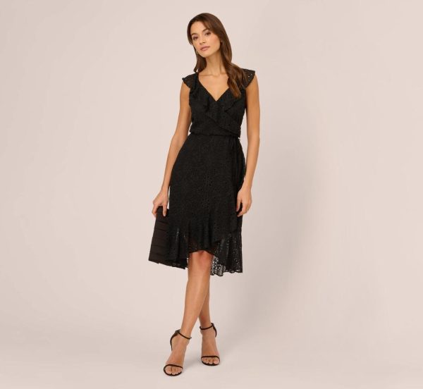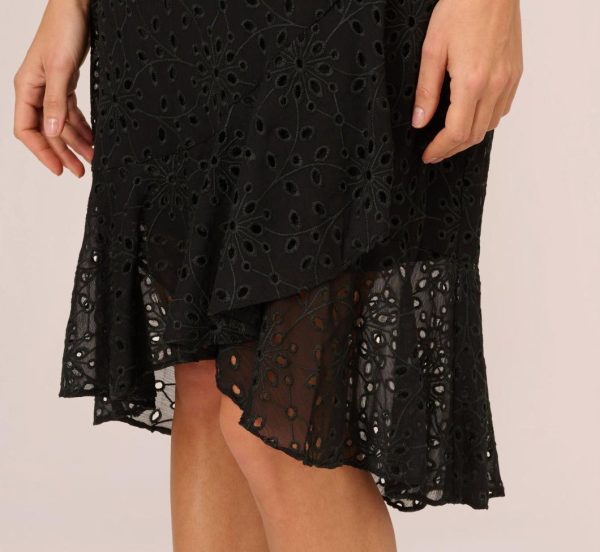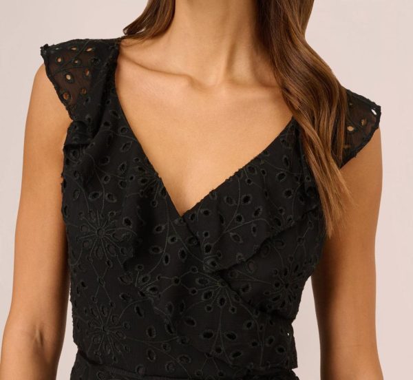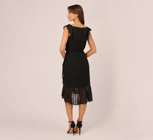Fall for the romantic details in this midi dress. This dress features a faux wrap bodice with v-neckline, cap sleeves, and a high-low skirt. Crafted from eyelet fabric, this midi dress has ruffled details throughout the bodice. Partially lined through the body, this dress is sheer at thehem and the sleeves. A zipper back closure completes this dress. Styled for day with a casual heel or sandal or for evening with nude heels and a beaded clutch, this eyelet dress is a perfect look.|