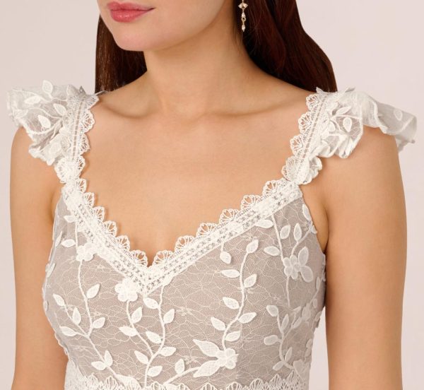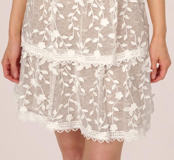 Make every moment memorable in this ruffle-trimmed lace dress. This fit and flare dress features a sweetheart neckline, tank straps trimmed with ruffle accents and scalloped edges, and a tiered soft skirt. Boasting a nude lining overlaid with a floral embroidered lace, this partydress has some stretch and is a comfortable look. A pretty choice for the bride-to-be or any summer event you have planned, this lace dress has a hidden zipper closure at the center back. Teamed with neutral heels and sparkling jewels, this cute dress is photo-ready.|
