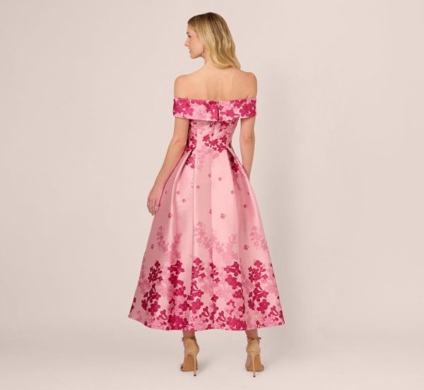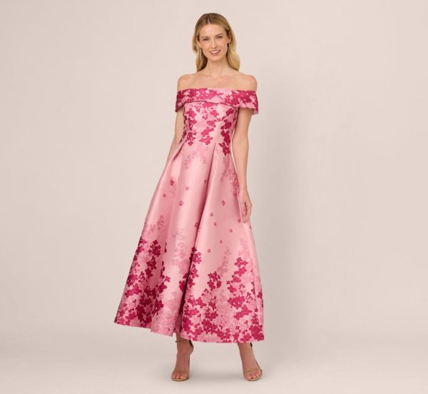 Structured and timelessly beautiful, this floral dress is the missing piece for your next evening out. This fit and flare dress features an off the shoulder neckline with foldover accent, ankle-length skirt, and pockets. Crafted from jacquard fabric boasting a contrasting metallicfloral print, this dress has no waist seam for a comfortable fit for all body types. This off the shoulder dress has minimal stretch. Styled with nude heels and your favorite clutch, this ankle-length dress scales from cocktail attire to black-tie.|