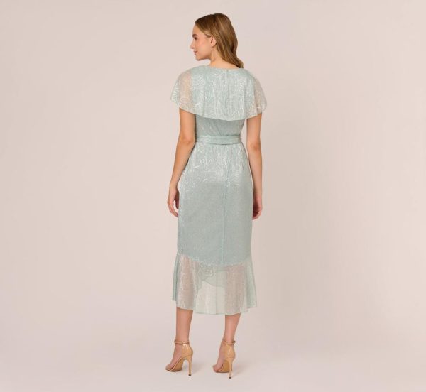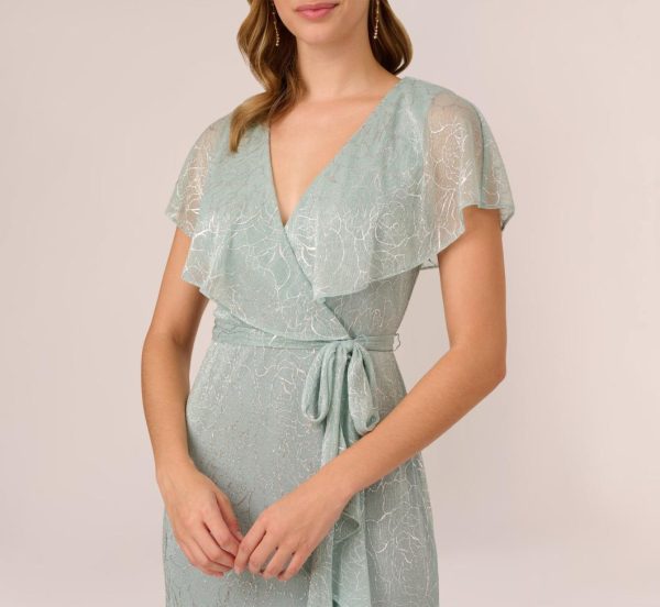 A striking metallic foil floral print gives a feminine spin to this mermaid dress crafted of a lightweight crinkled mesh. This charming dress features a ruffled capelet and a surplice neckline that descends to a midi skirt with playful cascading ruffle accent and ruffled hem. Finished with a self-tie belt to accentuate your waist. Back zipper with hook and eye closure. A versatile style to keep on rotation for bridal showers, engagement parties and wedding receptions.|