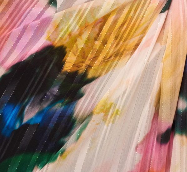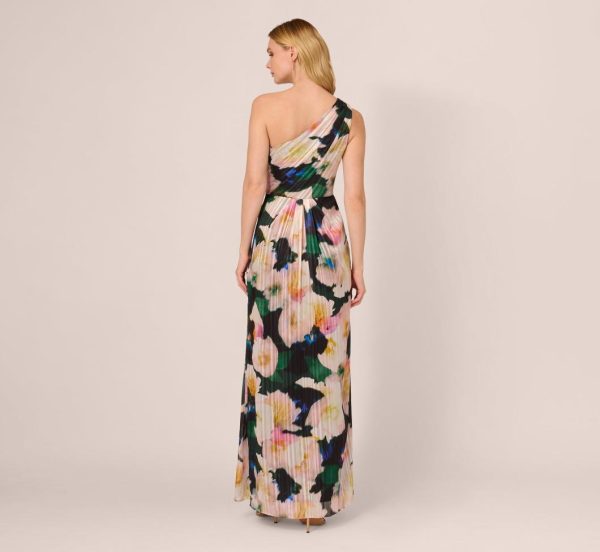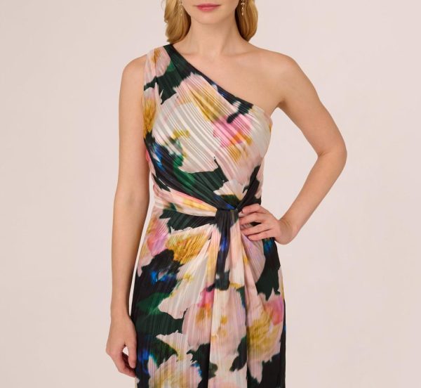 Modern texture and print lend themselves to this classic chiffon gown. This evening gown features a one shoulder neckline, fitted bodice, and flowing skirt. A knotted detail at the waist accentuates the wearer’s figure and creates a draped effect down the skirt. Fully lined, this gown is crafted from a floral print chiffon fabric with a mini-pleat textured look. A side zipper closure completes this one shoulder gown. This floral formal dress is an elegant choice when styled with nude heels and a velvet clutch.|