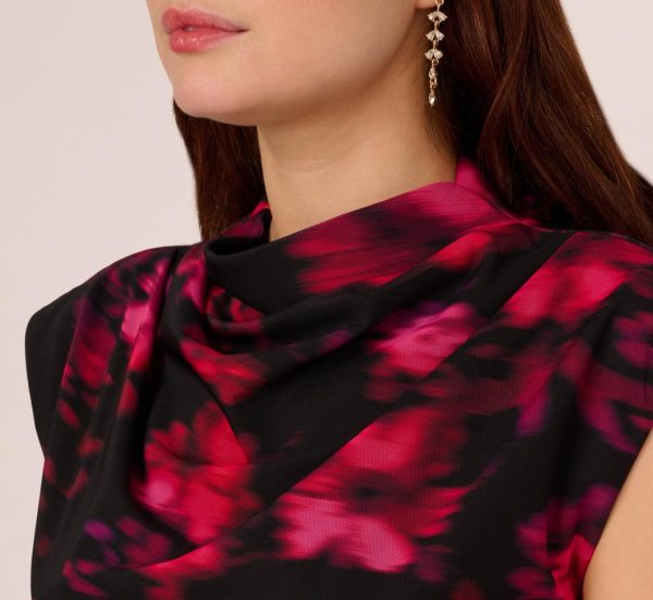 A bold print and modern silhouette makes this ankle-length dress stand out. This sheath dress features a fitted bodice with extended shoulder sleeves, a draped mock neckline, and a fitted skirt with thigh-high slit. Made with floral printed jersey fabric with generous stretch, this dresshas no waist seam and shirring through the body for a flattering fit. This pull-on dress is so versatile that a switch of accessories takes it from daytime to evening with ease.|