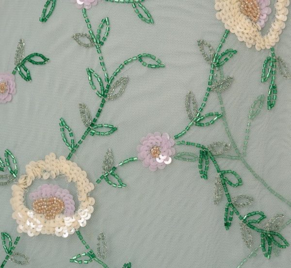 Timeless elegance meets floral romance in this gorgeous minty green flutter sleeve gown. A faux wrap design gives the dress a surplice neckline and a subtle high-low hem. Colorful hand-applied beading and sequins give this dress a touch of sparkle. Wear this shimmery dress for a sophisticated formal look with a sweet and charming finish.|
