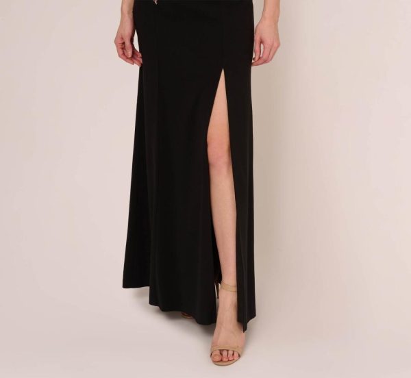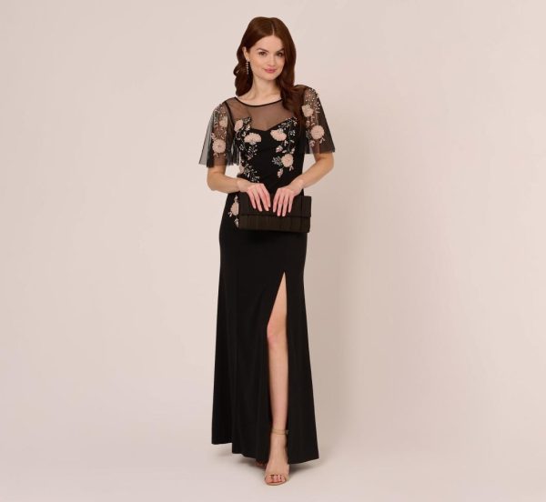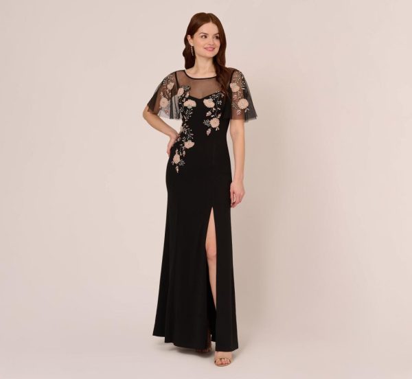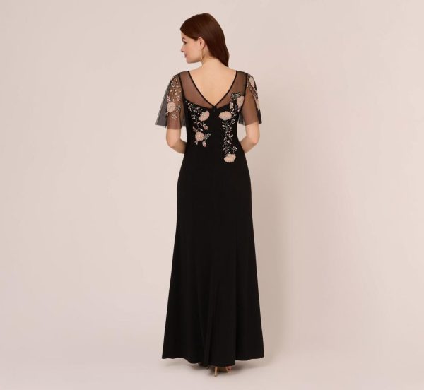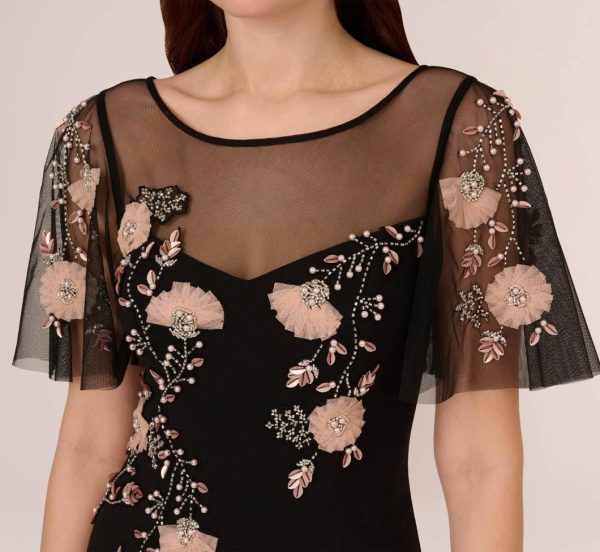 Lean into formal season with this sweetly beaded gown. This formal dress features a fitted bodice with boat neckline, a sheer yoke that gives a sweetheart neckline illusion, sheer flutter sleeves and a mermaid skirt with thigh-high slit. Crafted from crepe fabric through the body, thisdress has knit mesh at the bodice and sleeves that is embellished with beautiful sequin beaded florals. A hidden zipper closure at the sheer v-back completes this black-tie dress. Styled with neutral accessories that let the floral beading shine, this flutter short sleeve gown is a romanticlook.|
