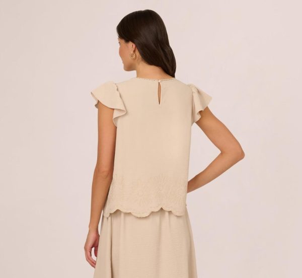 Soft and sophisticated, this airy top brings a graceful touch to any look. Crafted from lightweight, textured airflow fabric, it drapes effortlessly in a flowy silhouette. Delicate flutter sleeves create a hint of movement, while the scalloped hem is beautifully finished with tonal floral embroidery. A crew neckline, accented with fine scalloped lace trim, adds to the romantic charm. The back keyhole button closure ensures a refined finish, making this top a versatile choice for both casual and dressier occasions.|