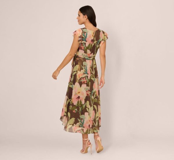 This dress is crafted from airy floral print chiffon, creating a light and graceful look that’s perfect for any special occasion. Flutter sleeves and a faux wrap bodice with a flattering tie waist shape the soft A line silhouette, while the high low skirt, finished with delicate ruffle trim, adds flowing movement. A discreet back zipper closure ensures a smooth fit, making this style an easy choice for garden parties, showers, and daytime celebrations.|