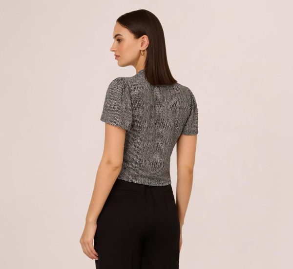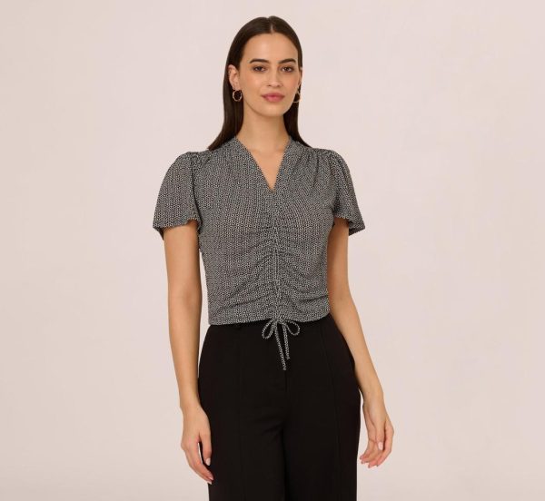 Refresh your separates wardrobe with this clever top, featuring a modern geometric print that adds a touch of refinement to your everyday look. The flutter sleeves and V-neckline create a feminine silhouette, while the adjustable front ruching with a tie finish lets you customize the fit. Designed with a pullover construction for effortless wear, this short sleeve top is a versatile addition to any closet.|