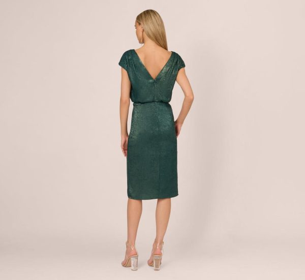 Subtle details make a big impact in this metallic midi dress. This cocktail dress features a blouson bodice, pleated cap sleeves, v-neck and v-back, and a faux wrap skirt. Designed with a luxe woven metallic fabric, this party dress easily transitions from cocktail to formal. A knotted detail at the side of the skirt adds interest and a draped design flatters the figure. A hidden zipper closure at the center back completes this short sleeve dress. Dressed to impress with nude heels and a sparkling clutch, this foil midi dress lives at the intersection of timeless and trendy.|